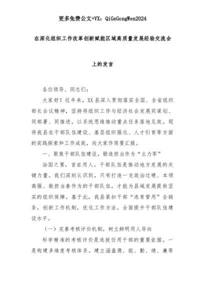 【七哥公文】2025年:在深化组织工作改革创新赋能区域高质量发展经验交流会上的发言+更多免费公文+VX:QiGeGongWen2024+更多免费公文+VX:QiGeGongWen2024