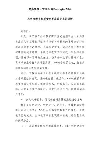 【七哥公文】2025年:在全市教育高质量发展座谈会上的讲话+更多免费公文+VX:QiGeGongWen2024+更多免费公文+VX:QiGeGongWen2024