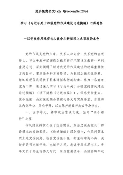 【七哥公文】2025年:学习《习近平关于加强党的作风建设论述摘编》心得感悟-以优良作风砥砺初心使命在新征程上永葆政治本色+更多免费公文+VX:QiGeGongWen2024+更多免费公文+VX:QiGeGongWen2024