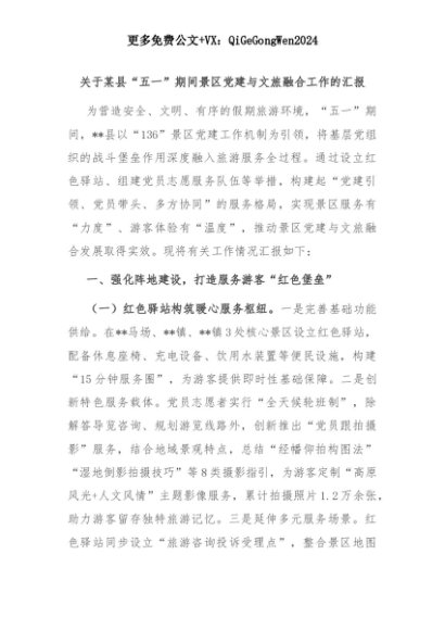 【七哥公文】2025年:关于某县“五一”期间景区党建与文旅融合工作的汇报+更多免费公文+VX:QiGeGongWen2024+更多免费公文+VX:QiGeGongWen2024