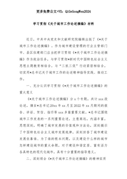 【七哥公文】2025年:学习贯彻《关于城市工作论述摘编》材料+更多免费公文+VX:QiGeGongWen2024+更多免费公文+VX:QiGeGongWen2024