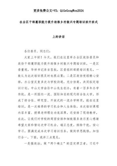【七哥公文】2025年:在全区干部履职能力提升助推乡村振兴专题培训班开班式上的讲话+更多免费公文+VX:QiGeGongWen2024+更多免费公文+VX:QiGeGongWen2024
