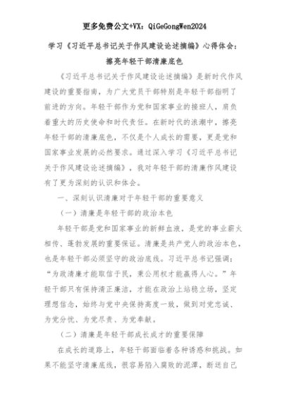 【七哥公文】2025年:学习《习近平总书记关于作风建设论述摘编》心得体会:擦亮年轻干部清廉底色+更多免费公文+VX:QiGeGongWen2024+更多免费公文+VX:QiGeGongWen2024