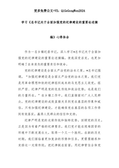 【七哥公文】2025年:学习《总书记关于全面加强党的纪律建设的重要论述摘编》心得体会+更多免费公文+VX:QiGeGongWen2024+更多免费公文+VX:QiGeGongWen2024