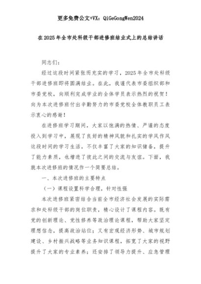 【七哥公文】2025年:在2025年全市处科级干部进修班结业式上的总结讲话+更多免费公文+VX:QiGeGongWen2024+更多免费公文+VX:QiGeGongWen2024