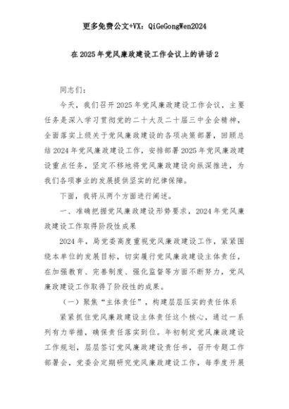 【七哥公文】2025年:在2025年党风廉政建设工作会议上的讲话2+更多免费公文+VX:QiGeGongWen2024+更多免费公文+VX:QiGeGongWen2024