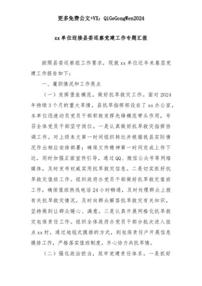 【七哥公文】2025年:xx单位迎接县委巡察党建工作专题汇报+更多免费公文+VX:QiGeGongWen2024+更多免费公文+VX:QiGeGongWen2024