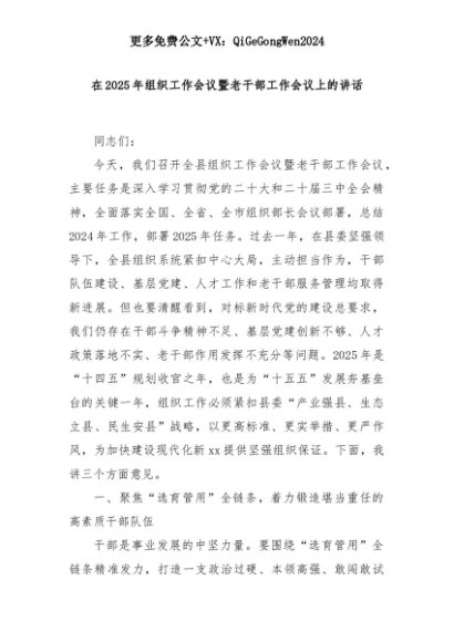 【七哥公文】2025年:在2025年组织工作会议暨老干部工作会议上的讲话+更多免费公文+VX:QiGeGongWen2024+更多免费公文+VX:QiGeGongWen2024