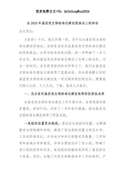 【七哥公文】2025年:在2025年基层党支部标准化建设现场会上的讲话+更多免费公文+VX:QiGeGongWen2024+更多免费公文+VX:QiGeGongWen2024