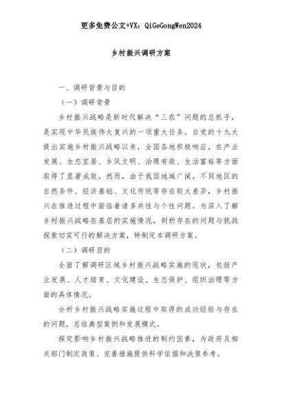 【七哥公文】2025年:乡村振兴调研方案+更多免费公文+VX:QiGeGongWen2024+更多免费公文+VX:QiGeGongWen2024