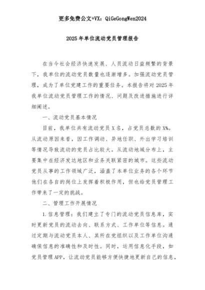 【七哥公文】2025年:2025年单位流动党员管理报告+更多免费公文+VX:QiGeGongWen2024+更多免费公文+VX:QiGeGongWen2024