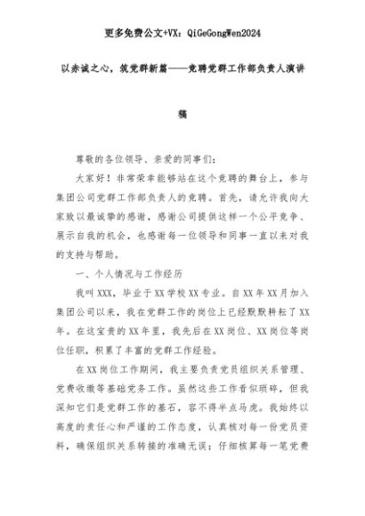 【七哥公文】2025年:以赤诚之心,筑党群新篇——竞聘党群工作部负责人演讲稿+更多免费公文+VX:QiGeGongWen2024+更多免费公文+VX:QiGeGongWen2024