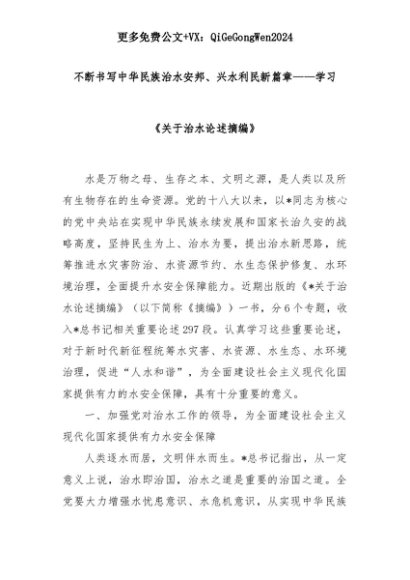 【七哥公文】2025年:不断书写中华民族治水安邦、兴水利民新篇章——学习《关于治水论述摘编》+更多免费公文+VX:QiGeGongWen2024+更多免费公文+VX:QiGeGongWen2024