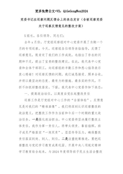 【七哥公文】2025年:党委书记在巡察问题反馈会上的表态发言(含被巡察党委关于巡察反馈意见的整改方案)+更多免费公文+VX:QiGeGongWen2024+更多免费公文+VX:QiGeGongWen2024