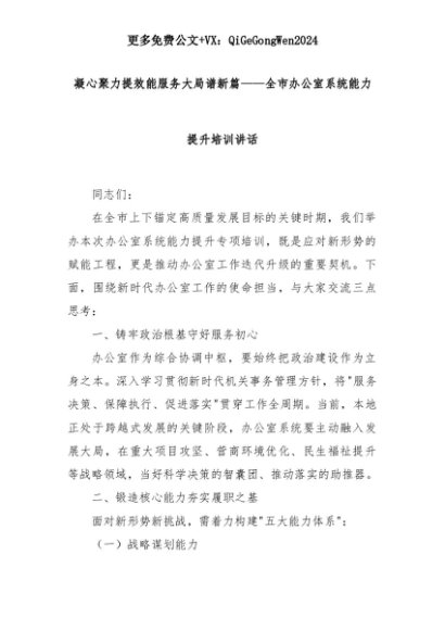 【七哥公文】2025年:凝心聚力提效能服务大局谱新篇——全市办公室系统能力提升培训讲话+更多免费公文+VX:QiGeGongWen2024+更多免费公文+VX:QiGeGongWen2024