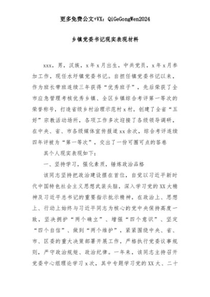 【七哥公文】2025年:乡镇党委书记现实表现材料+更多免费公文+VX:QiGeGongWen2024+更多免费公文+VX:QiGeGongWen2024