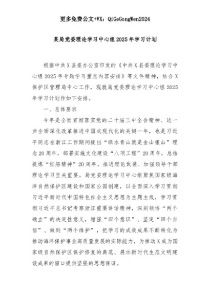【七哥公文】2025年:某局党委理论学习中心组2025年学习计划+更多免费公文+VX:QiGeGongWen2024+更多免费公文+VX:QiGeGongWen2024