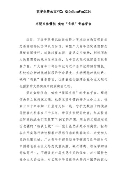 【七哥公文】2025年:牢记回信嘱托 喊响“有我”青春誓言+更多免费公文+VX:QiGeGongWen2024+更多免费公文+VX:QiGeGongWen2024