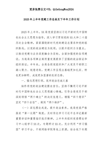 【七哥公文】2025年:2025年上半年党建工作总结及下半年工作计划+更多免费公文+VX:QiGeGongWen2024+更多免费公文+VX:QiGeGongWen2024