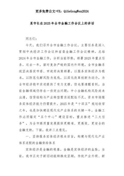 【七哥公文】2025年:某市长在2025年全市金融工作会议上的讲话+更多免费公文+VX:QiGeGongWen2024+更多免费公文+VX:QiGeGongWen2024