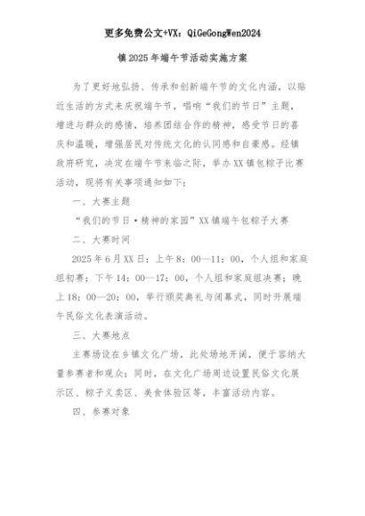 【七哥公文】2025年:镇2025年端午节活动实施方案+更多免费公文+VX:QiGeGongWen2024+更多免费公文+VX:QiGeGongWen2024
