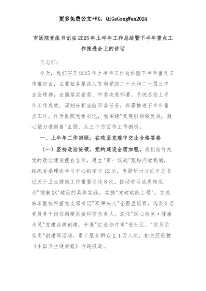【七哥公文】2025年:市医院党组书记在2025年上半年工作总结暨下半年重点工作推进会上的讲话+更多免费公文+VX:QiGeGongWen2024+更多免费公文+VX:QiGeGongWen2024