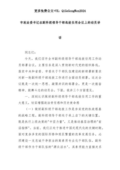 【七哥公文】2025年:市政法委书记在副科级领导干部选拔任用会议上的动员讲话+更多免费公文+VX:QiGeGongWen2024+更多免费公文+VX:QiGeGongWen2024