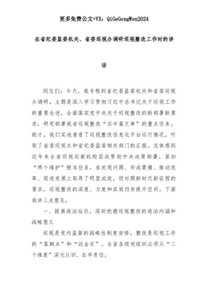 【七哥公文】2025年:在省纪委监委机关、省委巡视办调研巡视整改工作时的讲话+更多免费公文+VX:QiGeGongWen2024+更多免费公文+VX:QiGeGongWen2024