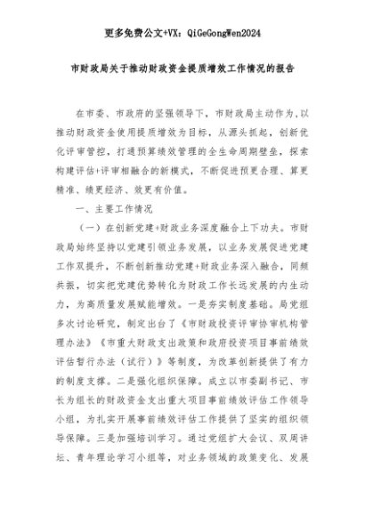 【七哥公文】2025年:市财政局关于推动财政资金提质增效工作情况的报告+更多免费公文+VX:QiGeGongWen2024+更多免费公文+VX:QiGeGongWen2024