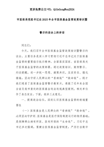 【七哥公文】2025年:市医保局党组书记在2025年全市医保基金监管政策培训暨警示约谈会上的讲话+更多免费公文+VX:QiGeGongWen2024+更多免费公文+VX:QiGeGongWen2024