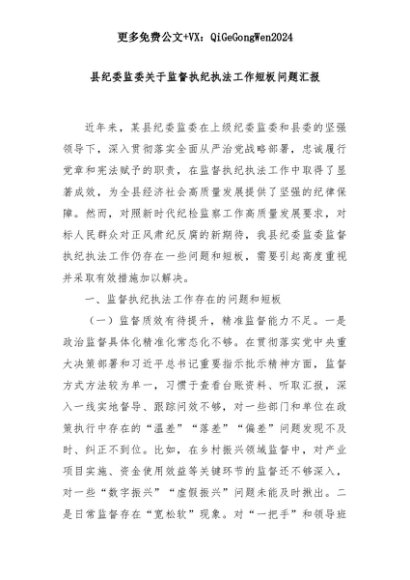 【七哥公文】2025年:县纪委监委关于监督执纪执法工作短板问题汇报+更多免费公文+VX:QiGeGongWen2024+更多免费公文+VX:QiGeGongWen2024