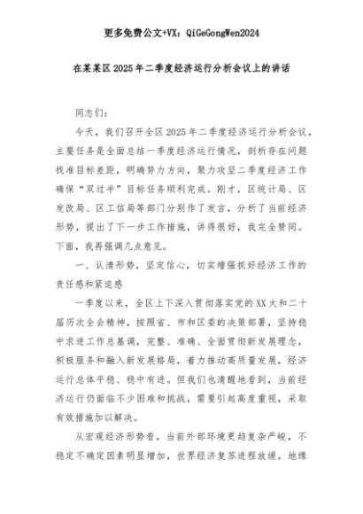 【七哥公文】2025年:在某某区2025年二季度经济运行分析会议上的讲话+更多免费公文+VX:QiGeGongWen2024+更多免费公文+VX:QiGeGongWen2024