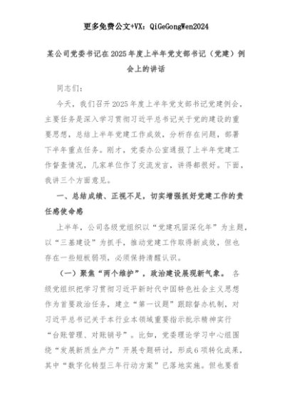 【七哥公文】2025年:某公司党委书记在2025年度上半年党支部书记(党建)例会上的讲话+更多免费公文+VX:QiGeGongWen2024+更多免费公文+VX:QiGeGongWen2024
