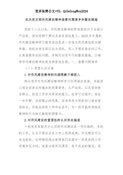 【七哥公文】2025年:机关党支部作风建设精神查摆问题清单和整改措施+更多免费公文+VX:QiGeGongWen2024+更多免费公文+VX:QiGeGongWen2024