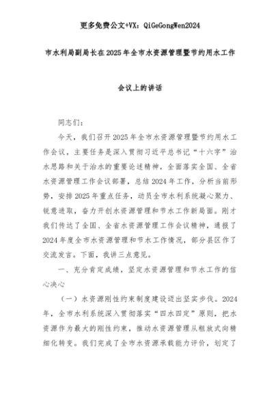 【七哥公文】2025年:市水利局副局长在2025年全市水资源管理暨节约用水工作会议上的讲话+更多免费公文+VX:QiGeGongWen2024+更多免费公文+VX:QiGeGongWen2024