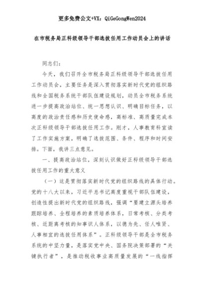 【七哥公文】2025年:在市税务局正科级领导干部选拔任用工作动员会上的讲话+更多免费公文+VX:QiGeGongWen2024+更多免费公文+VX:QiGeGongWen2024