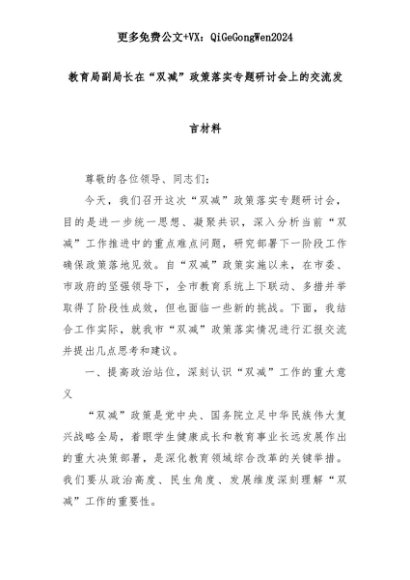 【七哥公文】2025年:教育局副局长在“双减”政策落实专题研讨会上的交流发言材料+更多免费公文+VX:QiGeGongWen2024+更多免费公文+VX:QiGeGongWen2024
