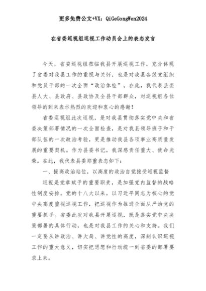 【七哥公文】2025年:在省委巡视组巡视工作动员会上的表态发言+更多免费公文+VX:QiGeGongWen2024+更多免费公文+VX:QiGeGongWen2024