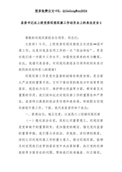 【七哥公文】2025年:县委书记在上级党委巡视巡察工作动员会上的表态发言2+更多免费公文+VX:QiGeGongWen2024+更多免费公文+VX:QiGeGongWen2024