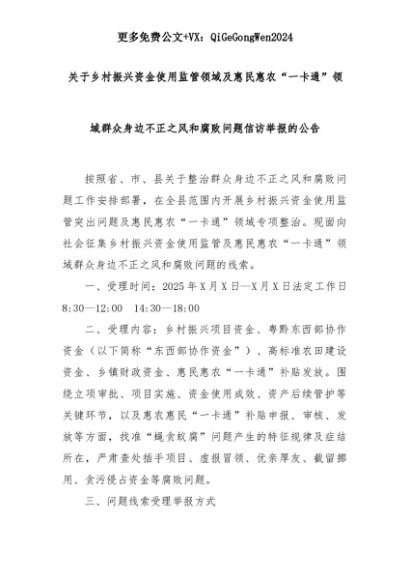 【七哥公文】2025年:关于乡村振兴资金使用监管领域及惠民惠农“一卡通”领域群众身边不正之风和腐败问题信访举报的公告+更多免费公文+VX:QiGeGongWen2024+更多免费公文+VX:QiGeGongWen2024