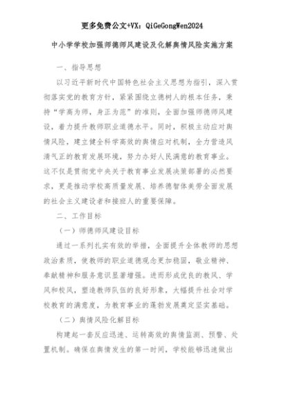 【七哥公文】2025年:中小学学校加强师德师风建设及化解舆情风险实施方案+更多免费公文+VX:QiGeGongWen2024+更多免费公文+VX:QiGeGongWen2024