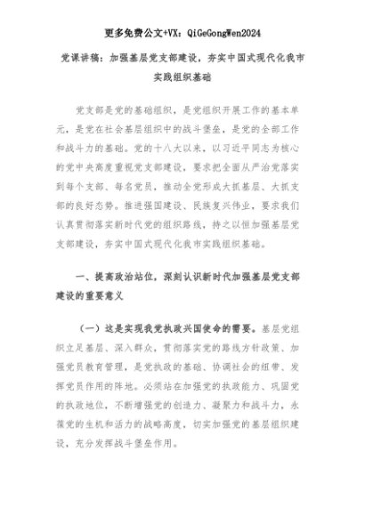 【七哥公文】2025年:党课讲稿:加强基层党支部建设,夯实中国式现代化我市实践组织基础+更多免费公文+VX:QiGeGongWen2024+更多免费公文+VX:QiGeGongWen2024