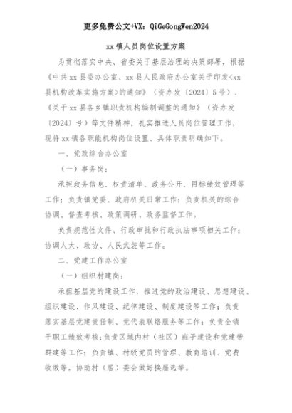 【七哥公文】2025年:xx镇人员岗位设置方案+更多免费公文+VX:QiGeGongWen2024+更多免费公文+VX:QiGeGongWen2024