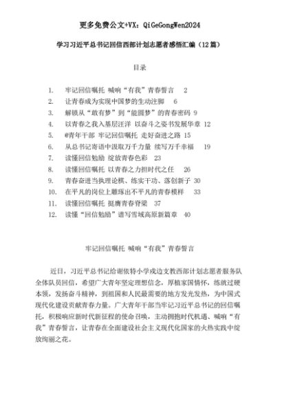 【七哥公文】2025年:(12篇)学习总书记回信西部计划志愿者感悟汇编+更多免费公文+VX:QiGeGongWen2024+更多免费公文+VX:QiGeGongWen2024