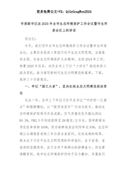 【七哥公文】2025年:市委副书记在2025年全市生态环境保护工作会议暨市生环委会议上的讲话+更多免费公文+VX:QiGeGongWen2024+更多免费公文+VX:QiGeGongWen2024