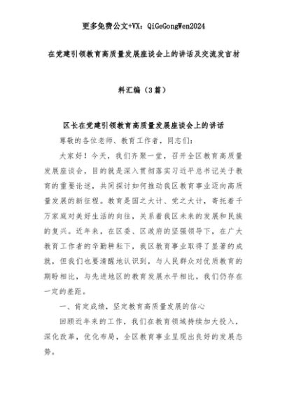 【七哥公文】2025年:(3篇)在党建引领教育高质量发展座谈会上的讲话及交流发言材料汇编+更多免费公文+VX:QiGeGongWen2024+更多免费公文+VX:QiGeGongWen2024