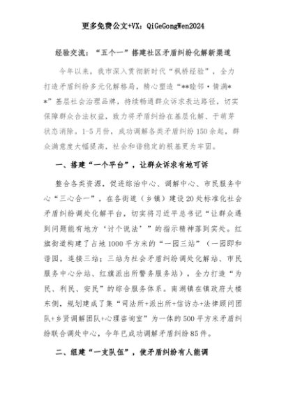 【七哥公文】2025年:经验交流:“五个一”搭建社区矛盾纠纷化解新渠道+更多免费公文+VX:QiGeGongWen2024+更多免费公文+VX:QiGeGongWen2024