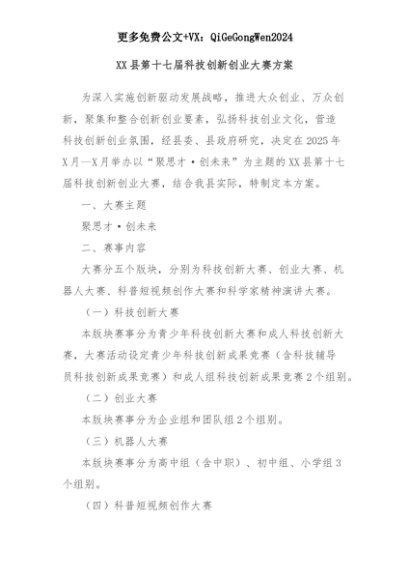 【七哥公文】2025年:XX县第十七届科技创新创业大赛方案+更多免费公文+VX:QiGeGongWen2024+更多免费公文+VX:QiGeGongWen2024