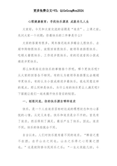 【七哥公文】2025年:心理健康教育:寻找快乐源泉 成就非凡人生+更多免费公文+VX:QiGeGongWen2024+更多免费公文+VX:QiGeGongWen2024