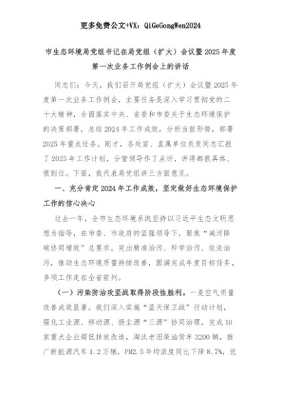 【七哥公文】2025年:市生态环境局党组书记在局党组(扩大)会议暨2025年度第一次业务工作例会上的讲话+更多免费公文+VX:QiGeGongWen2024+更多免费公文+VX:QiGeGongWen2024